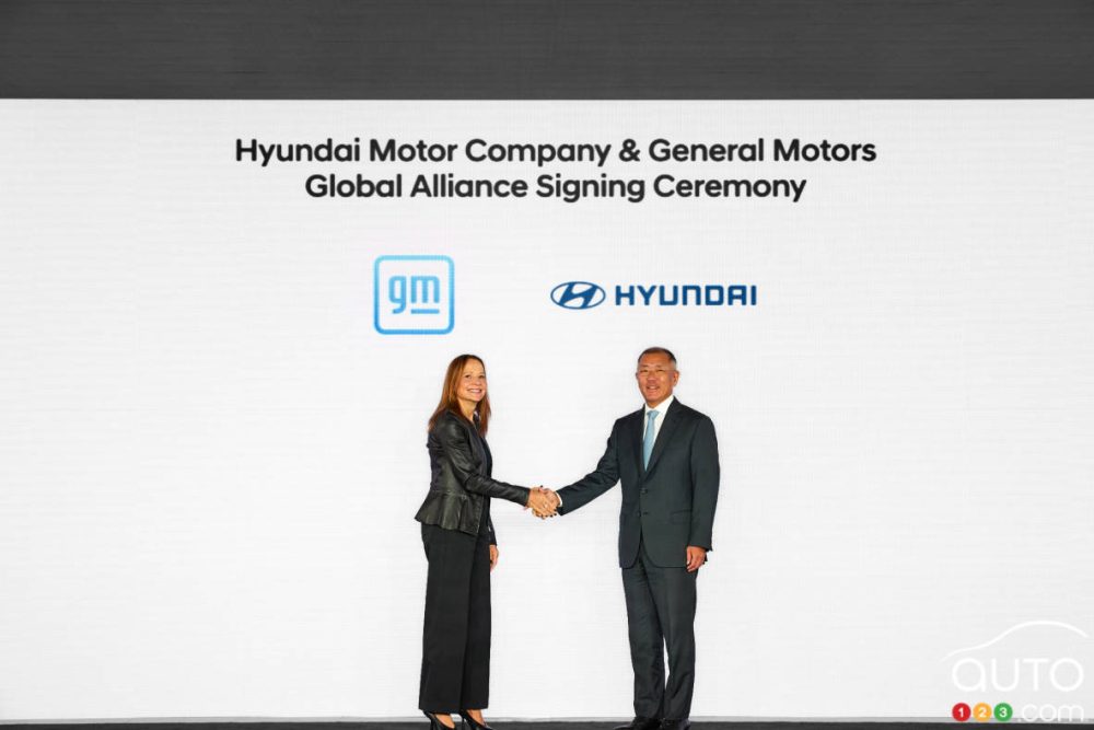 Mary Barra, la cheffe de la direction de General Motors, ainsi qu’Euisun Chung, le président exécutif du groupe Hyundai Moto, ont signé un protocole d’accord pour « évaluer immédiatement » les domaines de coopération et les accords contraignants potentiels entre les deux entreprises. Selon un communiqué conjoint publié le 12 septembre, les projets de collaboration envisagés incluent le développement et la production de véhicules, les moteurs à combustion interne, ainsi que les technologies énergétiques propres, électriques et à hydrogène.