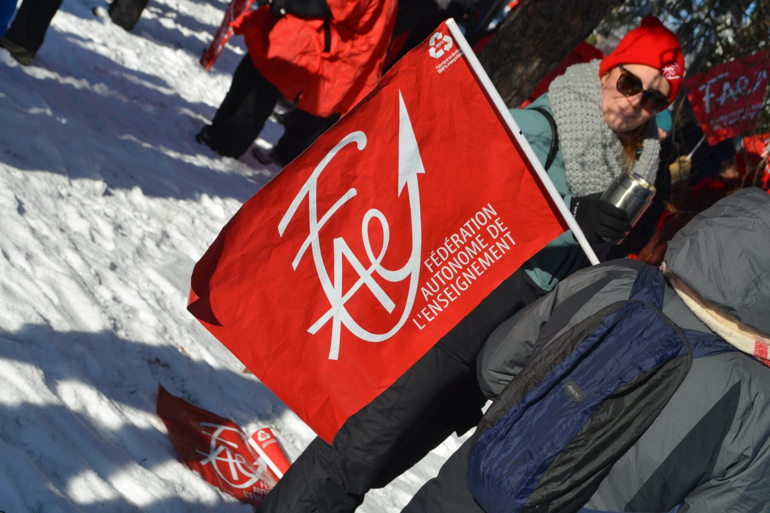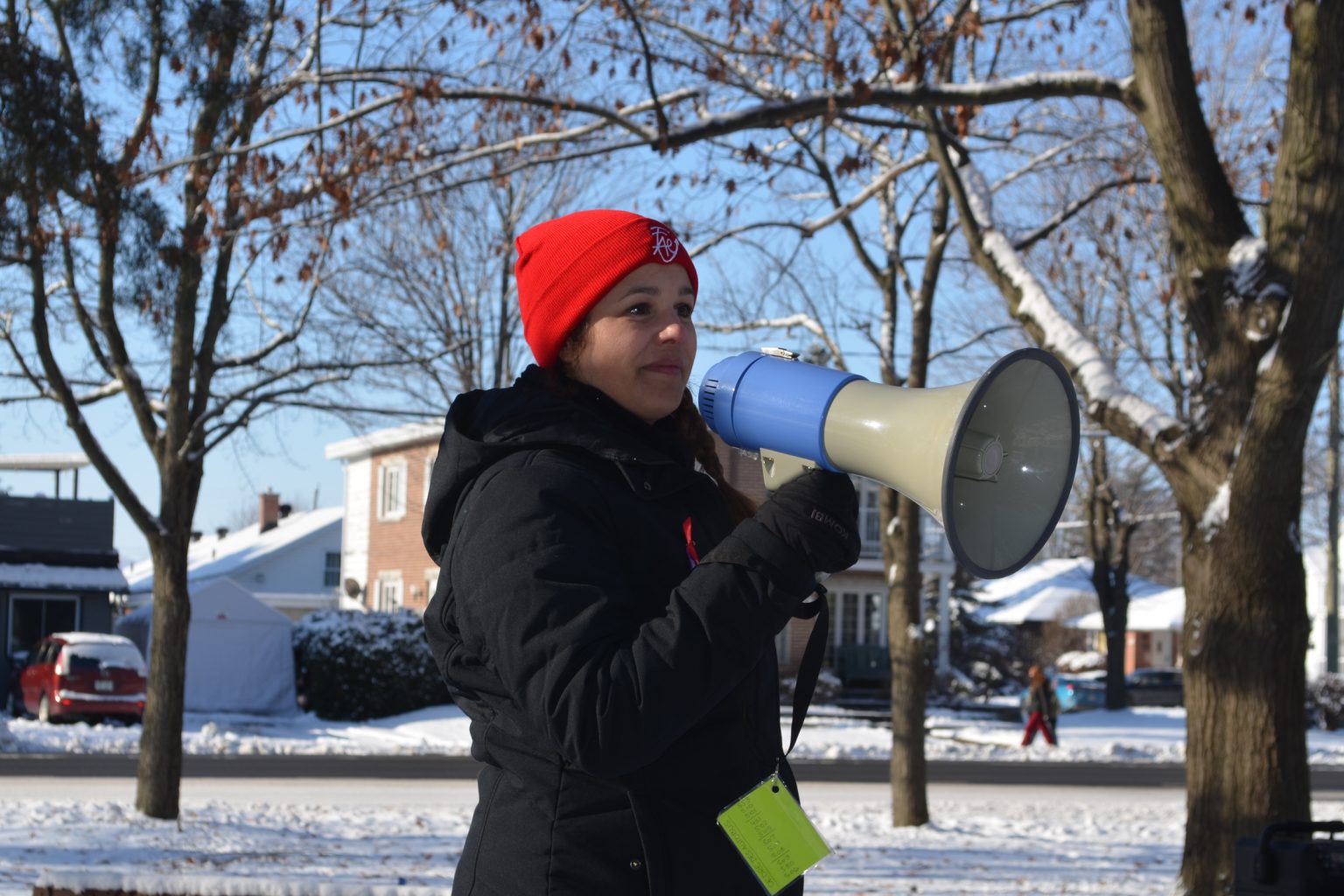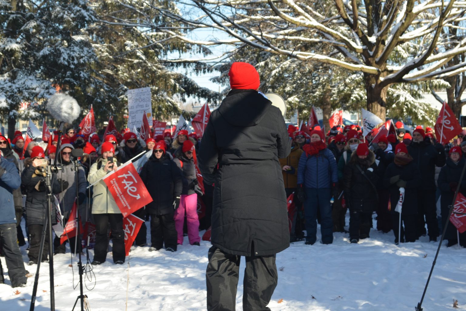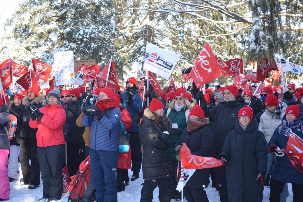 Arborant la tuque rouge, les membres du SEHY affiliés à la Fédération autonome de l’enseignement (FAE) se se sont ensuite rassemblés au parc Pelletier tout juste avant l’heure du midi pour écouter le discours de leur présidente Sophie Veilleux.