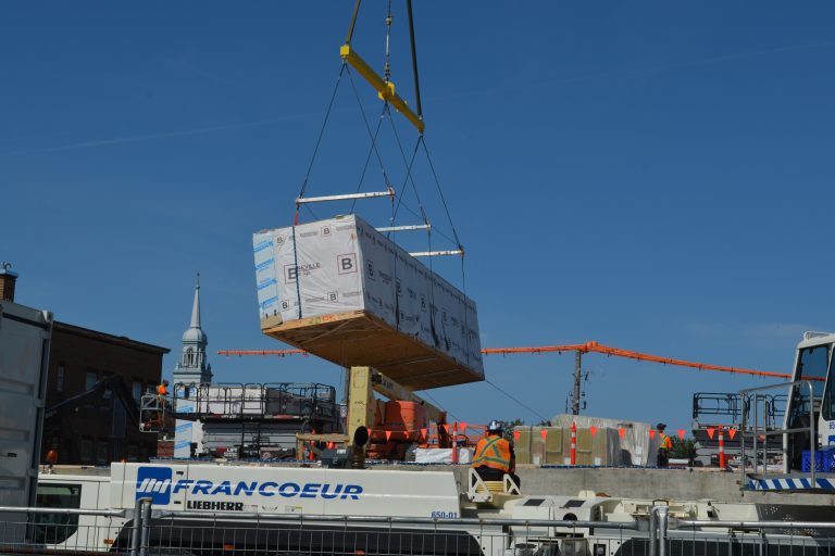 Au cours des trois prochaines semaines, les badauds seront nombreux aux alentours du chantier de construction du Médina sur la rue Centre. Les 110 unités modulaires, qui composeront le futur immeuble de 66 logements abordables, seront hissées l’une après l’autre à l’aide d’une imposante grue.